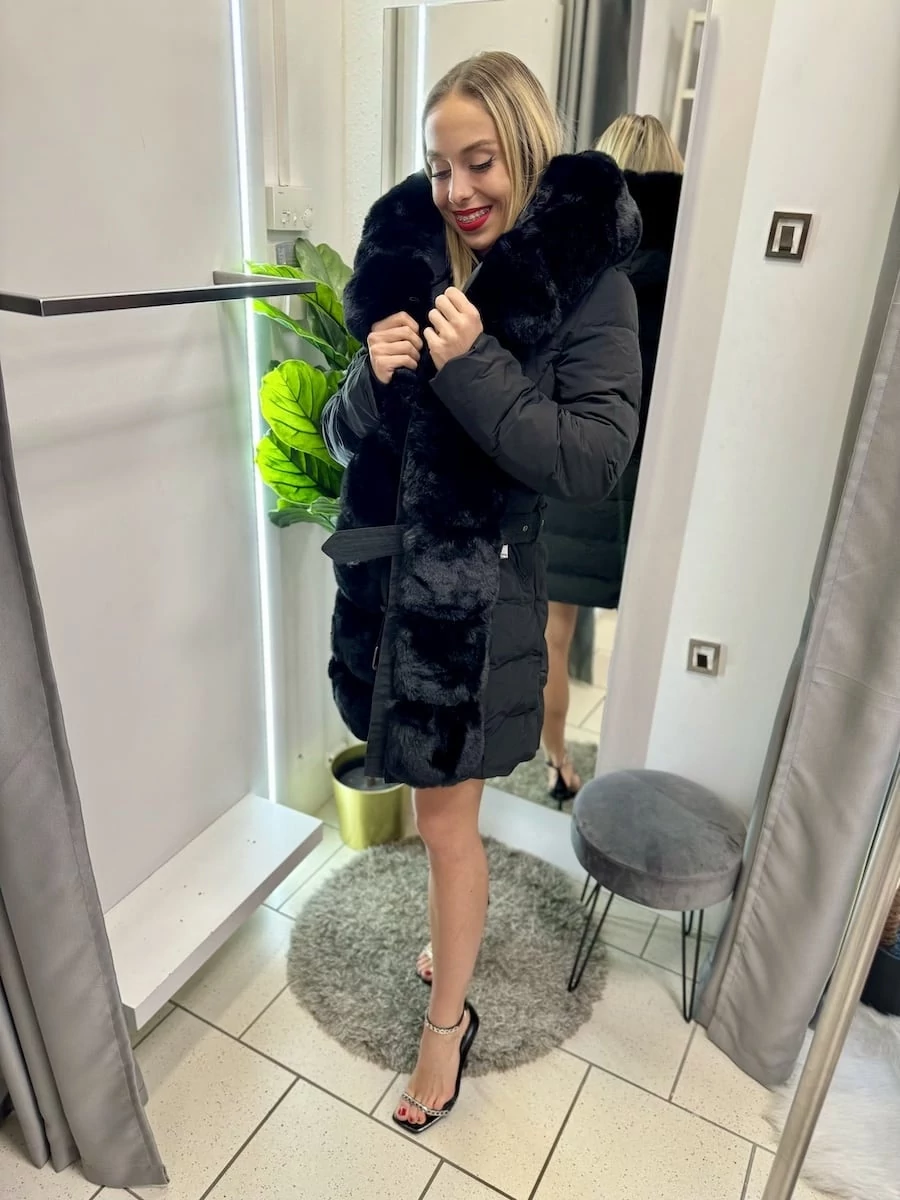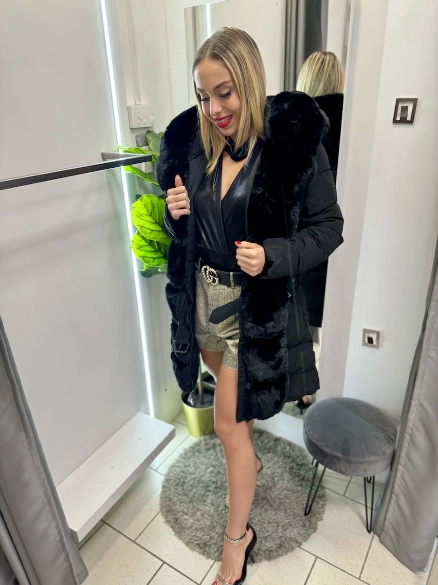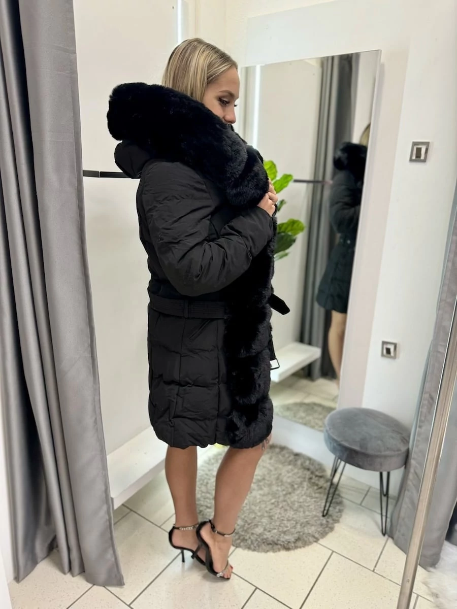 SZILVI derèkban szűkíthető - steppelt kabát - szőrmével - övvel